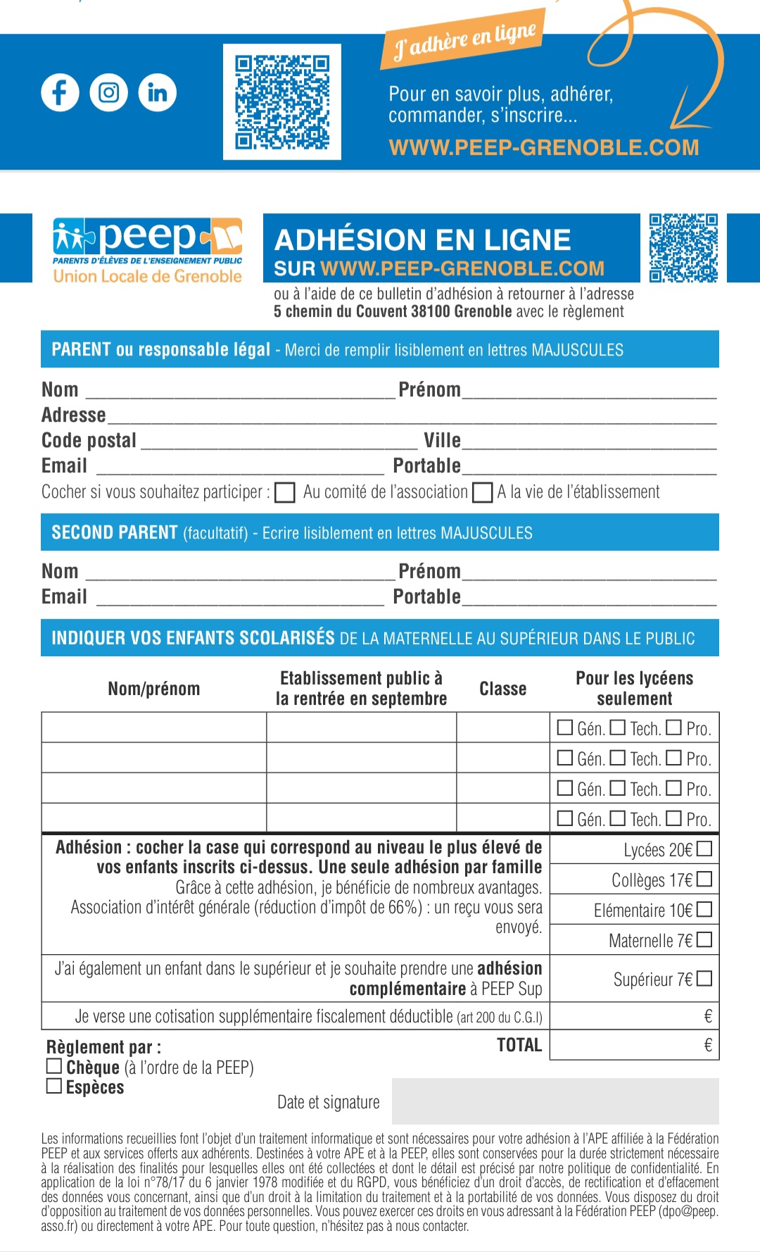Bulletin d'adhésion PEEP - 2025/2026